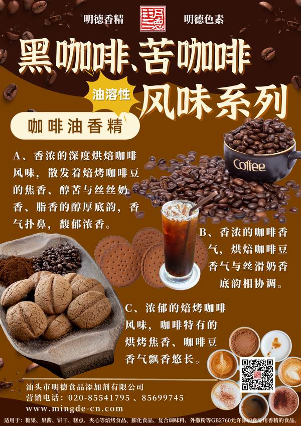 咖啡風(fēng)味醇香濃厚、香氣濃郁、耐溫性好、性價比高。汕頭明德食品添加劑潛心研發(fā)出20余款咖啡香精,咖啡、齋啡、拿鐵、瑪奇朵等風(fēng)味應(yīng)有盡有,從液體到粉末,從水溶到油溶,任君選擇。<產(chǎn)品參數(shù)>
