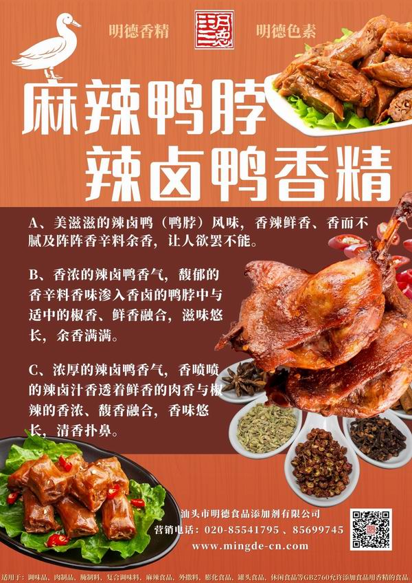 明德食品添加劑 還推出了麻辣鴨脖-辣鹵鴨香精,風(fēng)味香辣鮮香,伴著陣陣香辛料余香,同時(shí)椒辣香、鮮香、肉香融合,香味悠長。
