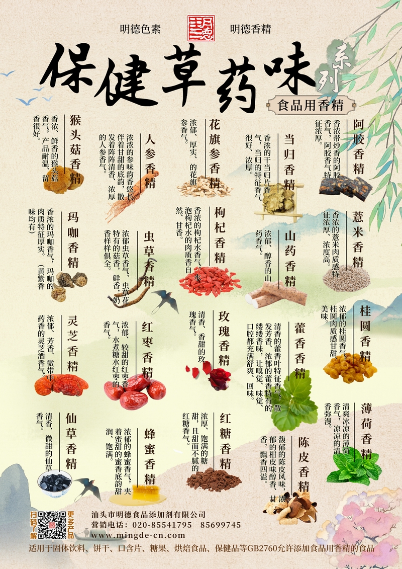 明德香精天然草藥風味香精系列 天然植香 層次鮮明汕頭市明德食品添加劑有限公司專為B端客戶研發(fā)天然草藥風味香精系列。產(chǎn)品模擬多種草藥與植物的天然香氣,清新自然,風味逼真。適用于飲料、糖果、零食、保健品及復(fù)合調(diào)味品的生產(chǎn),是您打造優(yōu)質(zhì)草本風味食品的可靠之選。